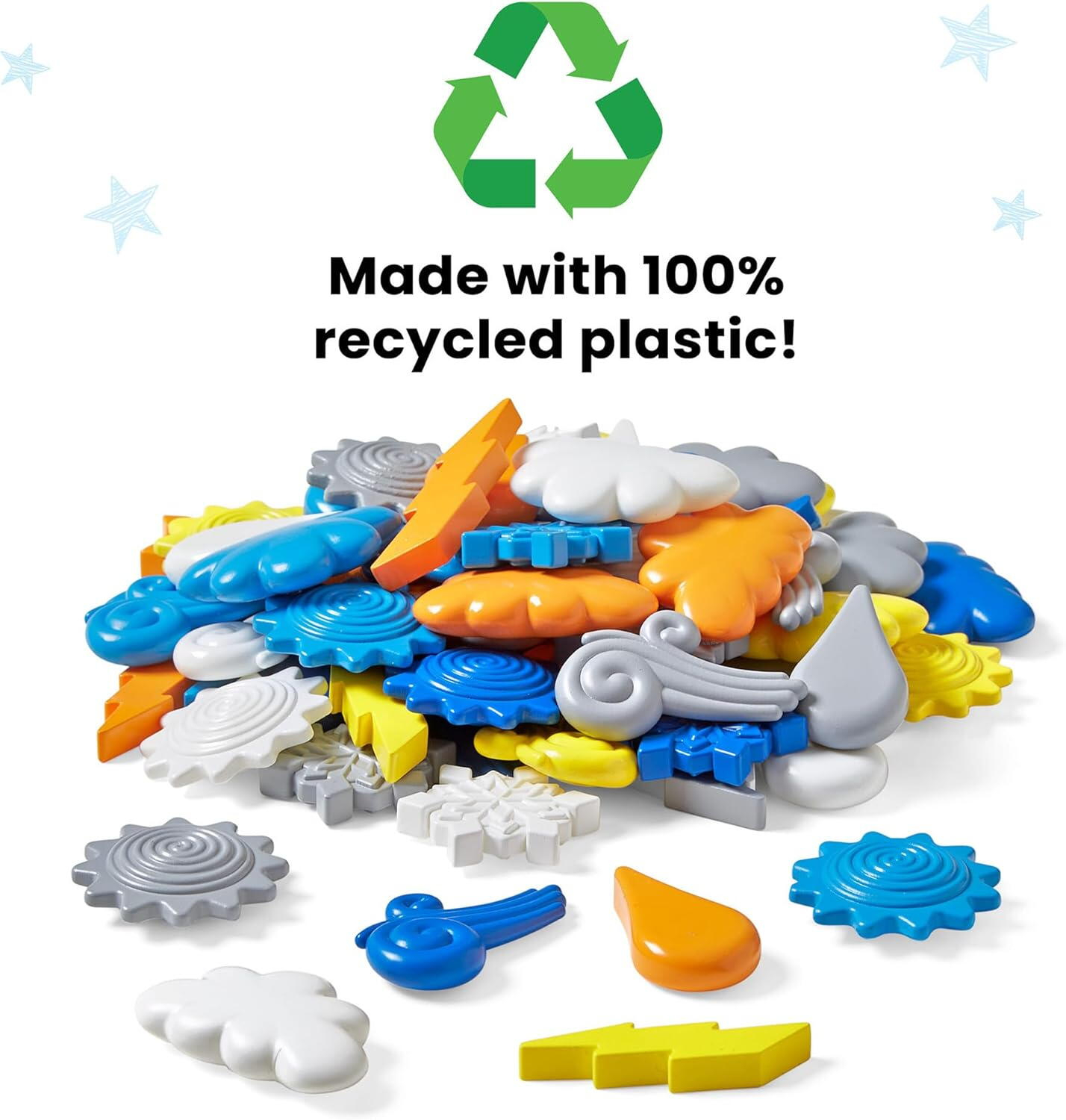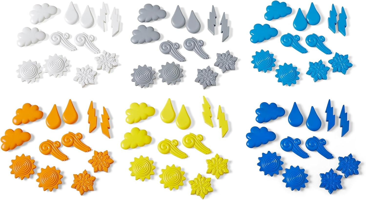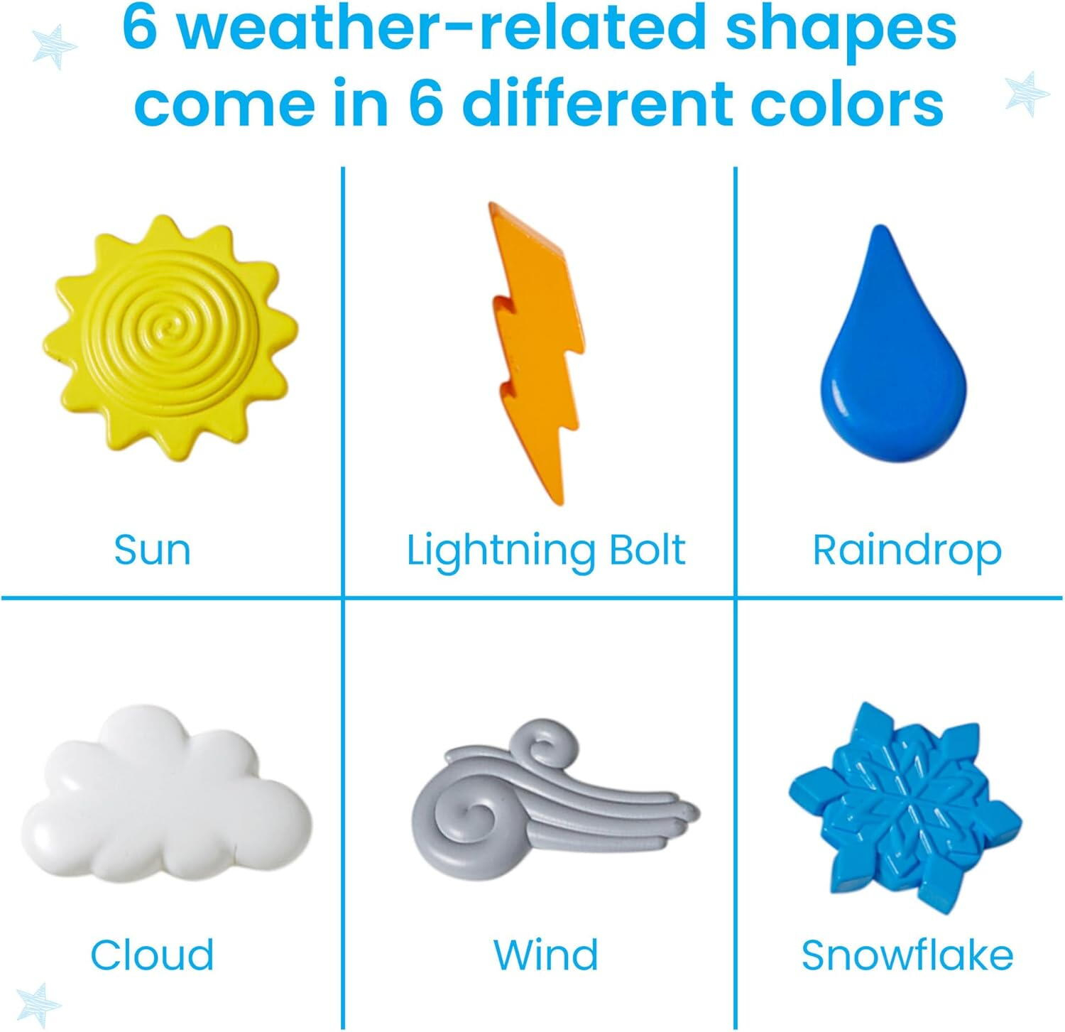 • 72 de figurine meteo in 6 forme diferite (soare, nor, fulger, picaturi de ploaie, vant si zapada)