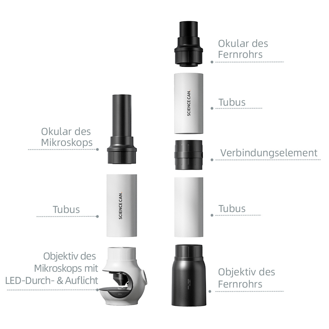 O singură jucărie - 2 posibilități: Combină cele două dispozitive optice complexe, de înaltă rezoluție și de calitate excelentă. Excursie în natură și în microcosmos! Micii exploratori ai naturii pot explora lumea într-un mod cu totul nou cu practicul microscop și telescop 2 în 1 . Combinația unică de microscop și telescop le permite copiilor să descopere secretele naturii. În câteva secunde și în doar câțiva pași simpli, ei pot transforma microscopul în telescop - sau telescopul în microscop. Mecanismul de conectare le permite copiilor să transforme singuri jucăria. Microscopul cu mărire de 250x și lumină transmisă și reflectată le permite să examineze cele mai mici organisme sau celule în toate detaliile lor. Pe de altă parte, cu funcția de telescop, ei pot vedea de aproape lucruri îndepărtate sau ființe vii cu o mărire de 20x.