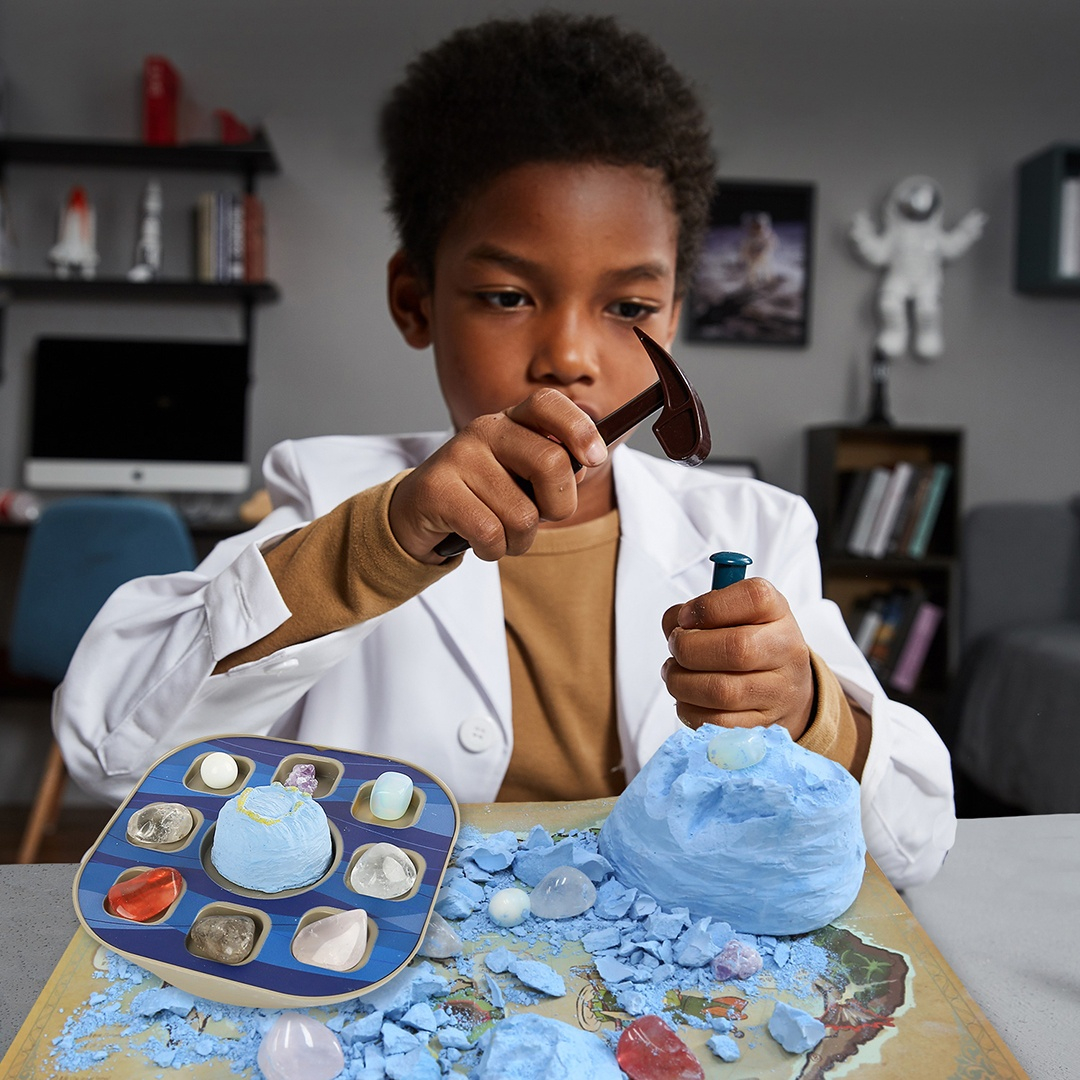 Copiii folosesc unelte de minerit realiste, cum ar fi ciocan și daltă, pentru a săpa cu atenție prin rocă și a căuta pietrele prețioase.