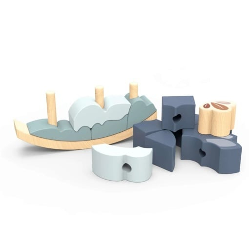 Jocul este o provocare interactivă de echilibru și îndemânare. Copilul trebuie să plaseze cele 13 piese din lemn pe baza în formă de val, cu o balenă echilibrându‑se deasupra, fără ca tot ansamblul să se dărâme. Perfect pentru joc individual sau în familie, clădirea fără răsturnare este dovada măiestriei – ultimul care adaugă o piesă fără să o răstoarne, câștigă!