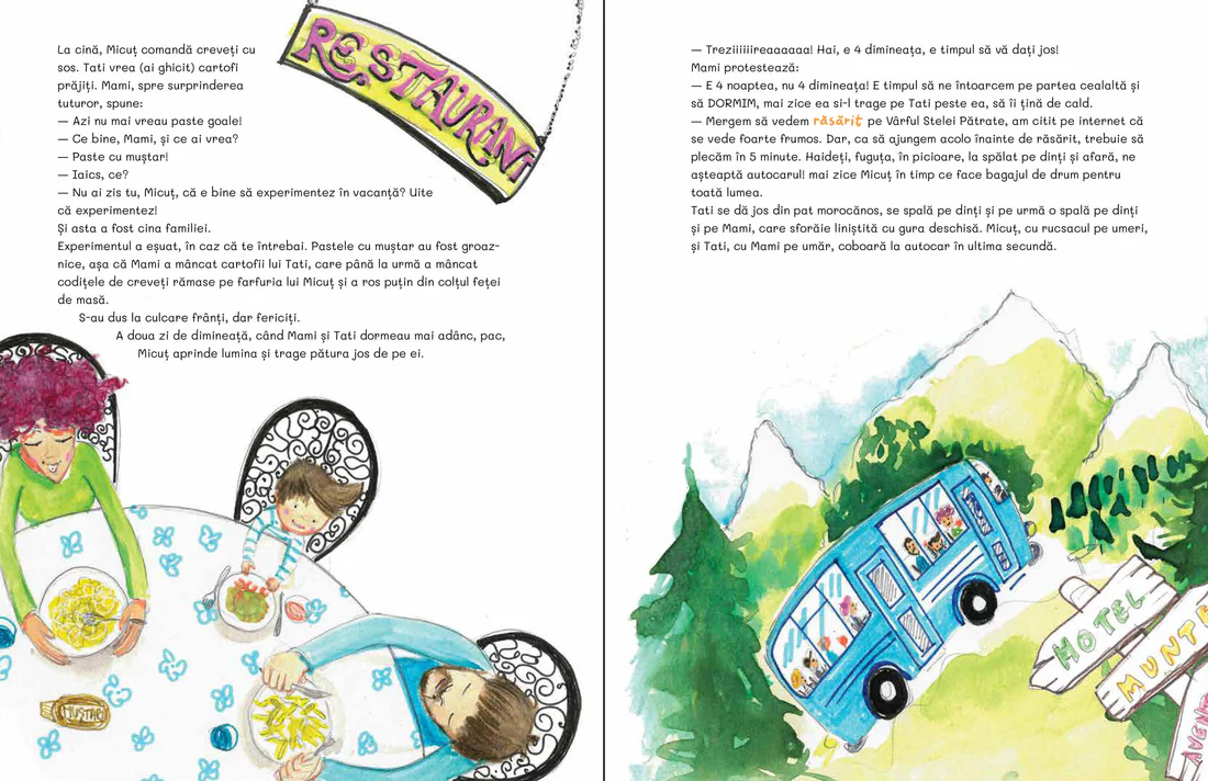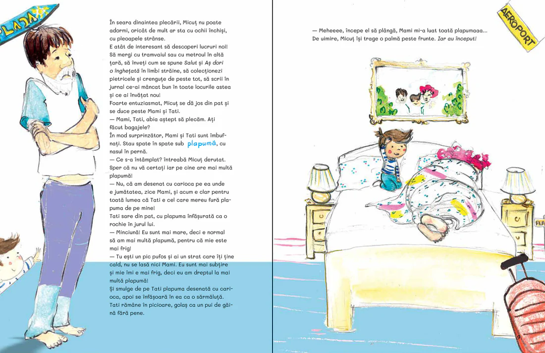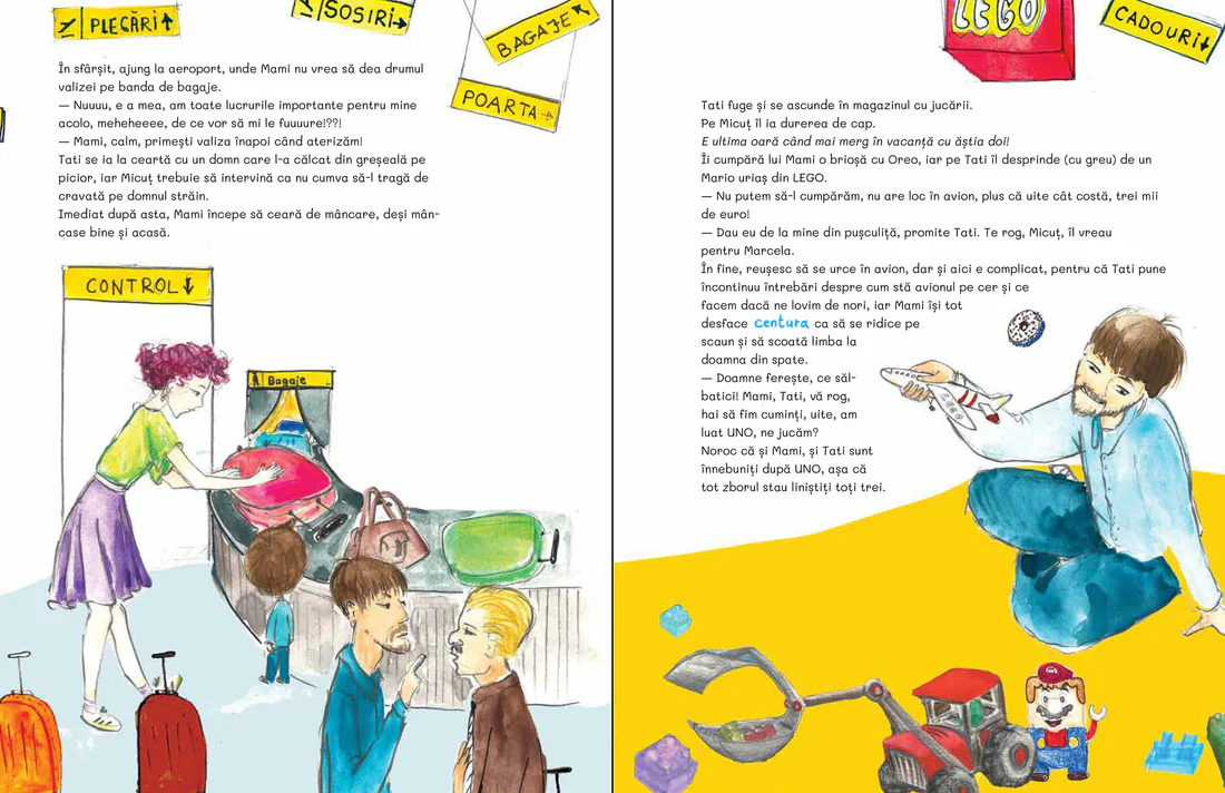 Cine spune că doar copiii fac mofturi în vacanță? Cartea aceasta vă invită într-un univers paralel, în care părinții protestează când sunt târâți de copil prin muzee, mănâncă doar paste fierte fără nimic altceva și cartofi prăjiți indiferent de destinație, se tem de avion și de apa din mare, vor să mai doarmă când e timpul să plece în explorare și să exploreze când e timpul de somn, își pierd peste tot bagajul. Și doar atunci când e timpul să plece spre casă își dau seama ce frumos e, de fapt, în vacanță!