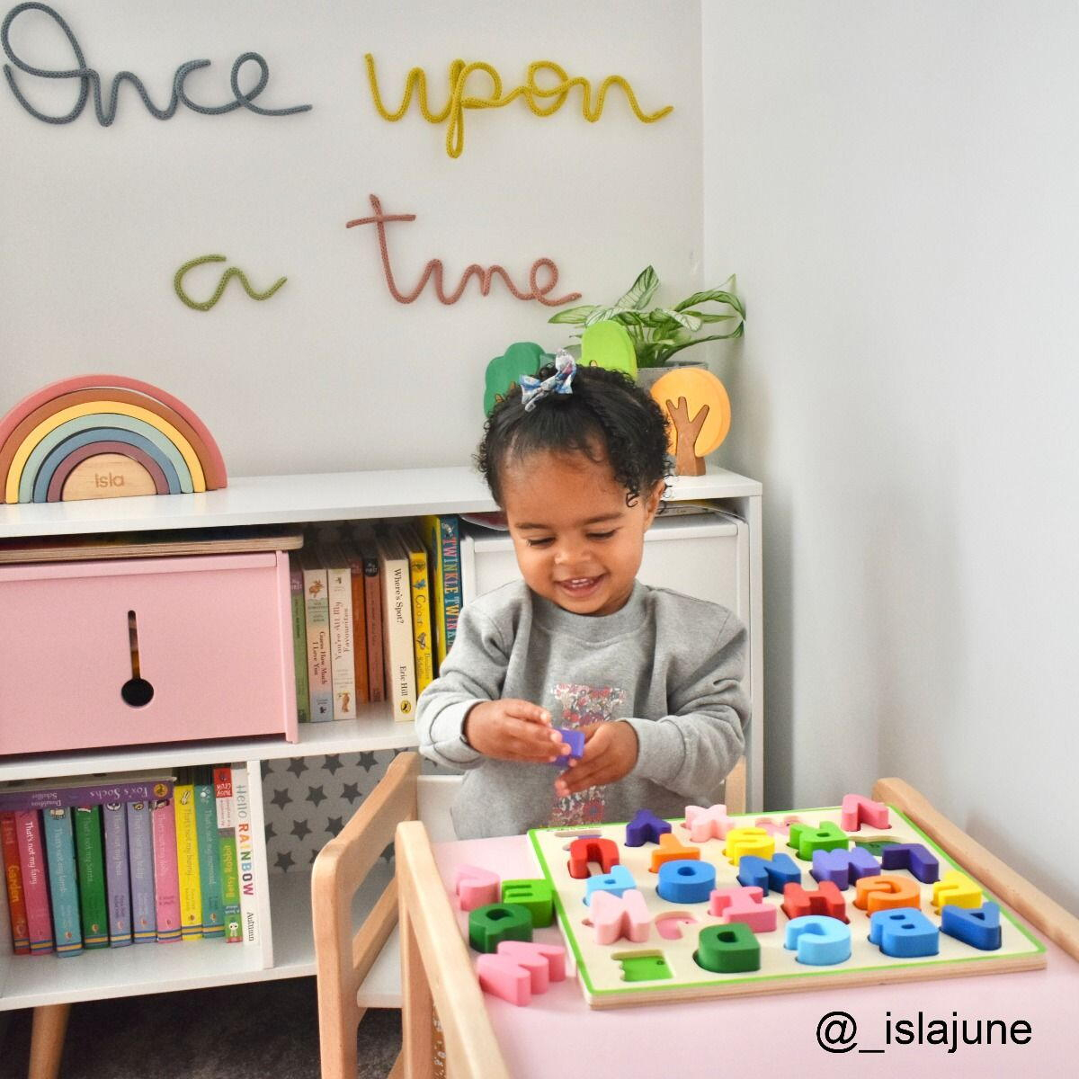 • fiecare piesa este confectionata din lemn rotunjit si are propria forma, culoare si litera pe tabla de lemn