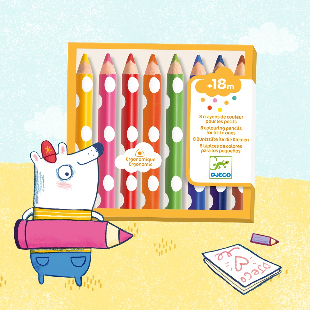 Conținut: 8 creioane colorate groase (galben, verde, roz, roșu, portocaliu, albastru deschis, albastru închis, maro).