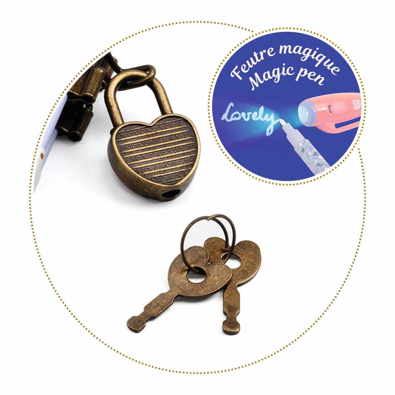 Jurnal cu 88 de pagini, hârtie de 120 gsm, coli liniate, lăcățel și 2 chei, 1 pix ”magic” a cărui pastă este invizibilă cu ochiul liber și scrisul se vede doar când este luminat cu lanterna de la capătul capacului (UV). Pixul funcționează cu baterii 3LR44 HD, care sunt incluse în set.