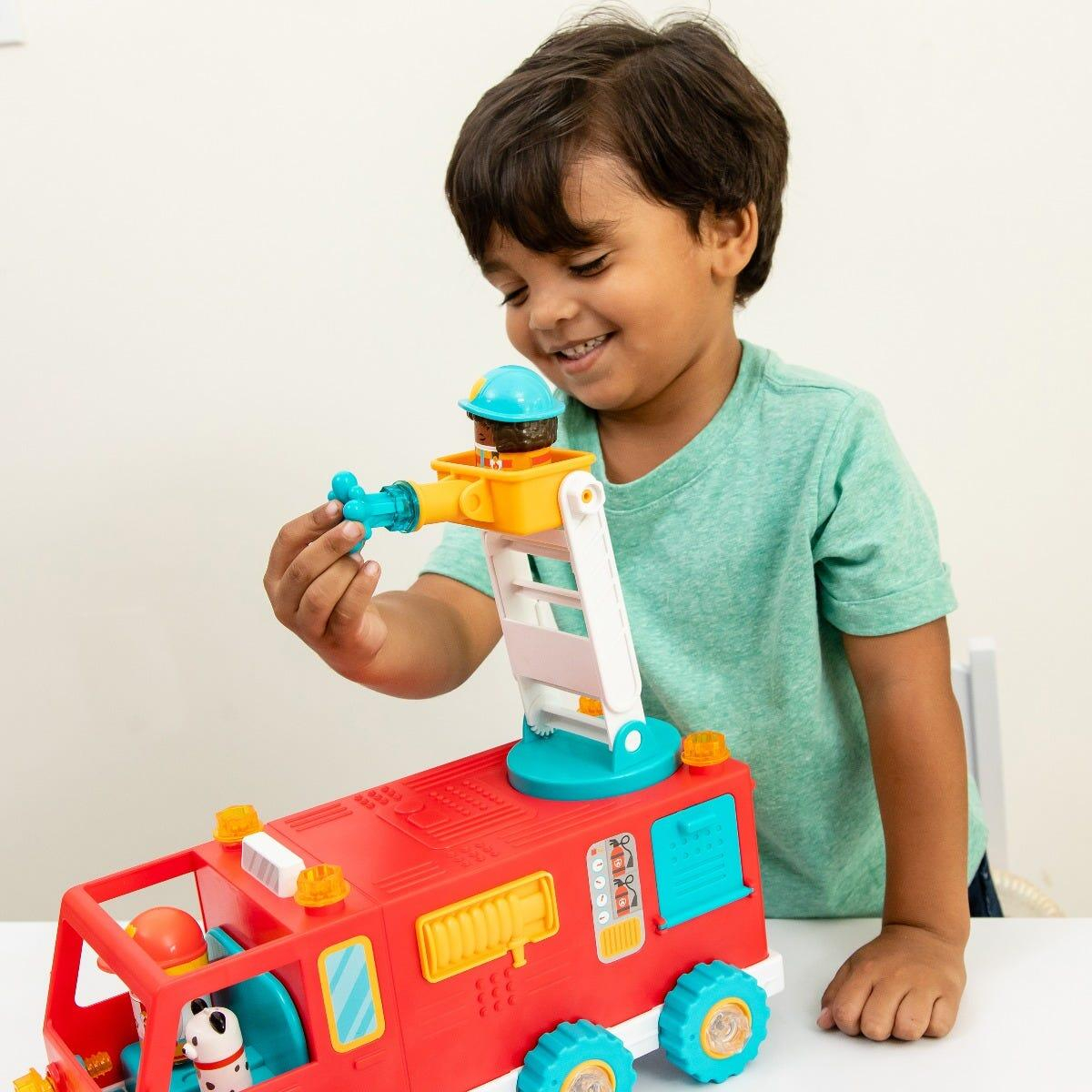 - copiii folosesc simpatica bormasina pentru a-si construi camionul de pompieri, iar cu ajutorul macaralei pot indeplini misiunea de stingere a incendiului