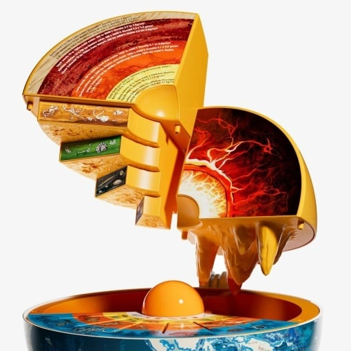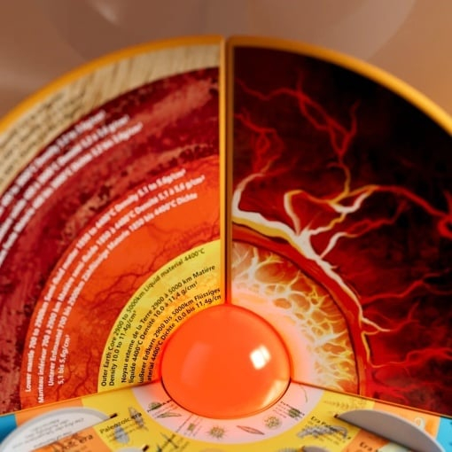 Pentru micii exploratori, acest glob 3D le permite să descopere continentele, straturile Pământului, fosilele și epocile geologice prin jocuri, lumini și carduri interactive. Globul se deschide pentru a dezvălui straturile interne ale Pământului, cu o lumină centrală care simulează nucleul fierbinte. Este prevăzut cu 12 carduri ilustrate (dublu față), peste 66 de informații educative și un mod chestionar cu 48 de întrebări pentru testarea cunoștințelor. Funcția de autocontrol le permite copiilor să verifice singuri răspunsurile, iar modul „enciclopedie” oferă explicații audio clare, captivante și ușor de înțeles.